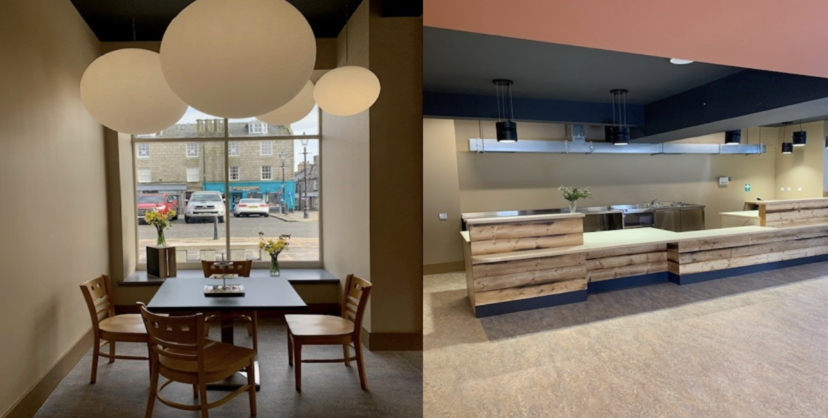 A large gallery (above) on the first floor, is suitable for events of all kinds. There’s also retail space (below) on the ground floor adjacent to the café with large display windows onto Deveron Street.