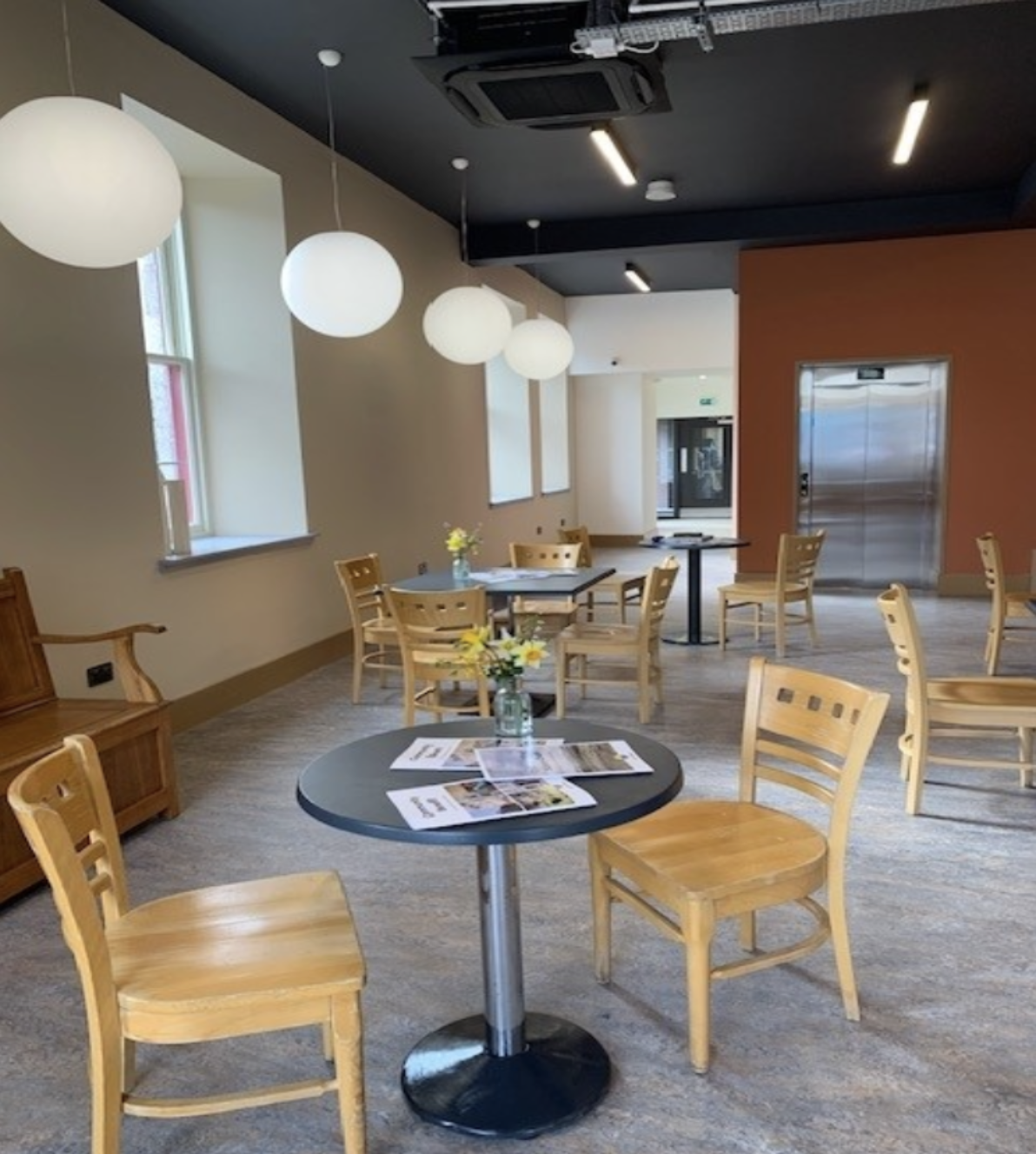 A two level coworking centre incorporating hotdesking on the first floor and fixed, contract desks on the second floor, all with large windows looking onto the Square, a family friendly café, learning and training spaces, meeting rooms ideal for numerous purposes and all ages.